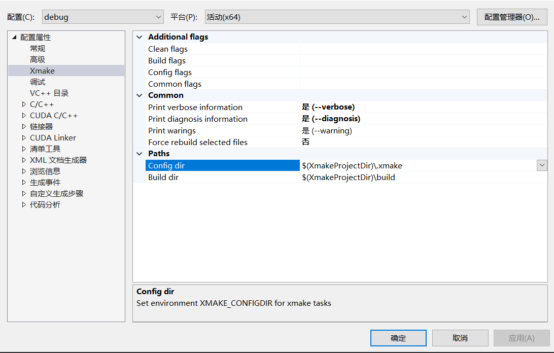 In addition, the vsxmake plugin will additionally generate a custom configuration property page for easy and flexible modification and appending some xmake compilation configuration in VS, and even switch to other cross toolchains in the configuration to achieve cross-compilation of other platforms such as Android, Linux.